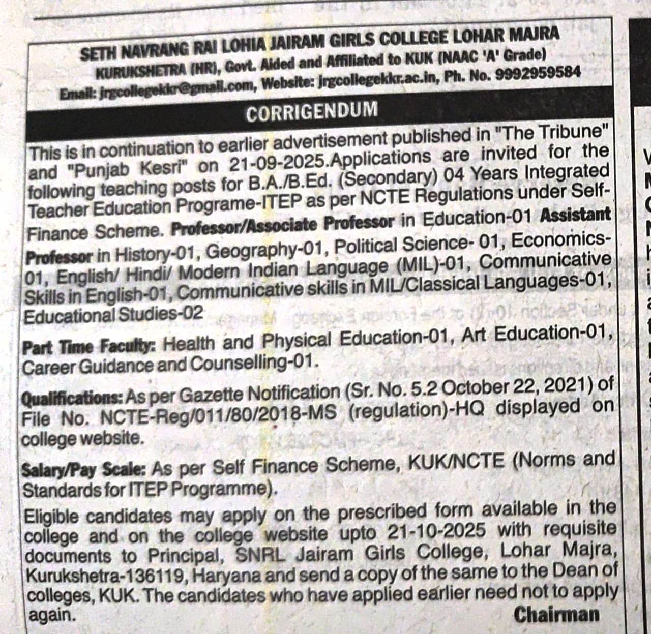 Seth Navrang Rai Lohia Jairam Girls College was established in 2001 by the great visionary, philosopher and social worker Late Shri Devender Sawroop Brahmchari Ji Maharaj with the noble cause of uplifting the rural women of India. His dream was to make education available to long suppressed rural women since they don’t get equal opportunities. He along with his disciple, Sh. Braham Sawroop Brahamchari ji Maharaj, the present chairman of the college, laid the foundation of this college at Lohar Majra, Kurukshetra, which is situated at the heart of rural environs at the banks of River Saraswati. Gram Panchayat, Lohar Majra and Lohia family played a significant role in the realization of his dreams by making immense contribution in the establishment and growth of the college.